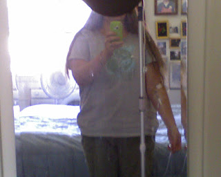But this is a better view than the one I took a few months ago during an iv treatment. This is me, in our bedroom, just before I went online during today's iv to host an Author Chat with Ann Hood on GoodReads.com. (Author of "The Knitting Circle.") I couldn't wait for today's iv - I've been so tired, stiff, swollen and in so much pain! At least I know the meds are working!